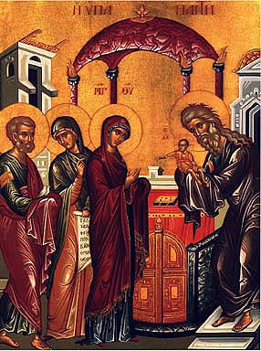 The Meeting of the Lord -- Today the Church commemorates an important event in the earthly life of our Lord Jesus Christ (Lk 2:22-40). Forty days after His birth the God-Infant was taken to the Jerusalem Temple, the center of the nation's religious life. According to the Law of Moses (Lev 12:2-8), a woman who gave birth to a male child was forbidden to enter the Temple of God for forty days. At the end of this time the mother came to the Temple with the child, to offer a young lamb or pigeon to the Lord as a purification sacrifice. The Most Holy Virgin, the Mother of God, had no need of purification, since she had given birth to the Source of purity and sanctity without defilement. However, she humbly fulfilled the requirements of the Law.Posted by Clifton at February 2, 2006 01:11 PM | TrackBackAt this time the righteous Elder Symeon (February 3) was living in Jerusalem. It had been revealed to him that he would not die until he should behold the promised Messiah. By inspiration from above, St. Symeon went to the Temple at the very moment when the Most Holy Theotokos and St. Joseph had brought the Infant Jesus to fulfill the Law.