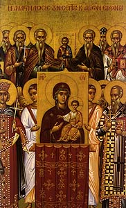The dominant theme of this Sunday since 843 has been that of the victory of the icons. In that year the iconoclastic controversy, which had raged on and off since 726, was finally laid to rest, and icons and their veneration were restored on the first Sunday in Lent. Ever since, that Sunday been commemorated as the "triumph of Orthodoxy."Orthodox teaching about icons was defined at the Seventh Ecumenical Council of 787, which brought to an end the first phase of the attempt to suppress icons. That teaching was finally re-established in 843, and it is embodied in the texts sung on this Sunday.