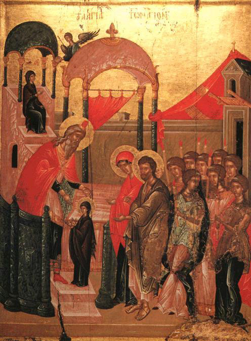 If a tree is known by its fruit, and a good tree bears good fruit (Mt. 7:17; Lk. 6:44), then is not the Mother of Goodness Itself, She who bore the Eternal Beauty, incomparably more excellent than every good, whether in this world or the world above? Therefore, the coeternal and identical Image of goodness, Preeternal, transcending all being, He Who is the preexisting and good Word of the Father, moved by His unutterable love for mankind and compassion for us, put on our image, that He might reclaim for Himself our nature which had been dragged down to uttermost Hades, so as to renew this corrupted nature and raise it to the heights of Heaven. For this purpose, He had to assume a flesh that was both new and ours, that He might refashion us from out of ourselves. Now He finds a Handmaiden perfectly suited to these needs, the supplier of Her own unsullied nature, the Ever-Virgin now hymned by us, and Whose miraculous Entrance into the Temple, into the Holy of Holies, we now celebrate. God predestined Her before the ages for the salvation and reclaiming of our kind. She was chosen, not just from the crowd, but from the ranks of the chosen of all ages, renowned for piety and understanding, and for their God-pleasing words and deeds.In the beginning, there was one who rose up against us: the author of evil, the serpent, who dragged us into the abyss. Many reasons impelled him to rise up against us, and there are many ways by which he enslaved our nature: envy, rivalry, hatred, injustice, treachery, slyness, etc. In addition to all this, he also has within him the power of bringing death, which he himself engendered, being the first to fall away from true life.