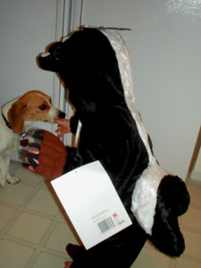 At home we tried on one of the trial Halloween costumes, but decided to return for something more scary. This is "Lil' Stinker."