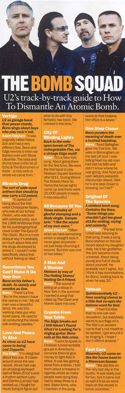 Remember when The Edge's copy of the new U2 album was stolen from a photo shoot in the south of France? Blender magazine was there. In fact, they spent several days with U2 and it made for a nice read. Even better is a track by track guide to How to Dismantle an Atomic Bomb narrated by U2, also at this link.